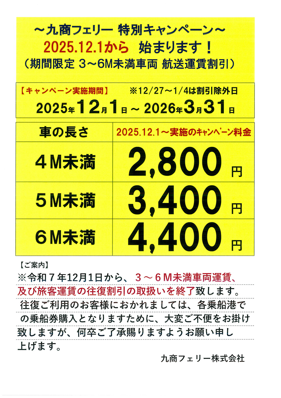 期間限定自動車航送運賃割引・「全便割」のお知らせ(6M未満車両)